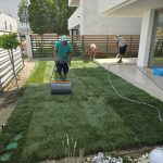 Imediat după montarea gazonului, l-am udat pentru a-i asigura umiditatea necesară înrădăcinării rapide. Udarea este un pas esențial după montarea gazonului rulou, mai ales în primele săptămâni, când acesta are nevoie de apă constantă pentru a se prinde bine.